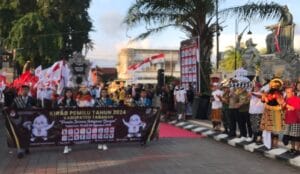 TABANAN – Sebag tahapan dari rangkaian kegiatan Pemilu 2024 yang akan berlangsung pada Rabu, 14 Februari 2024, Komisi Pemilihan Umum (KPU) melaksanakan Kirab Bendera Parpol peserta Pemilu Tahun 2024 dengan tema “Pemilu Sebagai Sarana Integritas Bangsa. Kegiatan berlangsung pada Jum’at tanggal 18 Agustus 2023 sore di Taman Bung Karno – Tabanan.