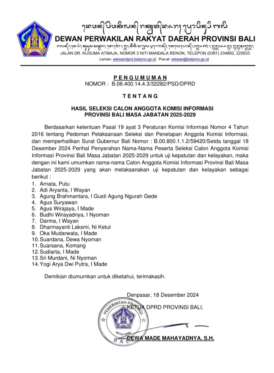 Merujuk Surat No. B.08.400.14.4.3/32282/PSD/DPRD, Ketua DPRD Provinsi Bali Dewa Made Mahayadnya mengumumkan Hasil Seleksi Calon Anggota KI Bali Masa Jabatan 2025-2029. (red)