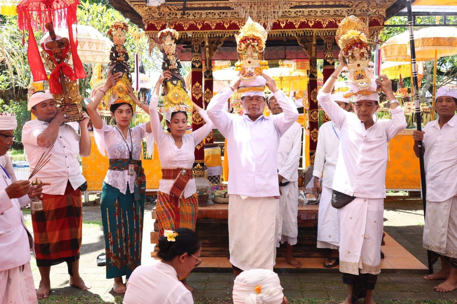 “Dengan pelaksanaan penyineban serangkaian Karya Melspas Caru Manca Rupa Lan Piodalan Mapedudusan Alit ini mari kita tingkatkan rasa sradha bhakti kita sebagai upaya menjaga keharmonisan antara parahyangan, pawongan, dan palemahan sebagai impelementasi Tri Hita Karana,” ujar Alit Wiradana.