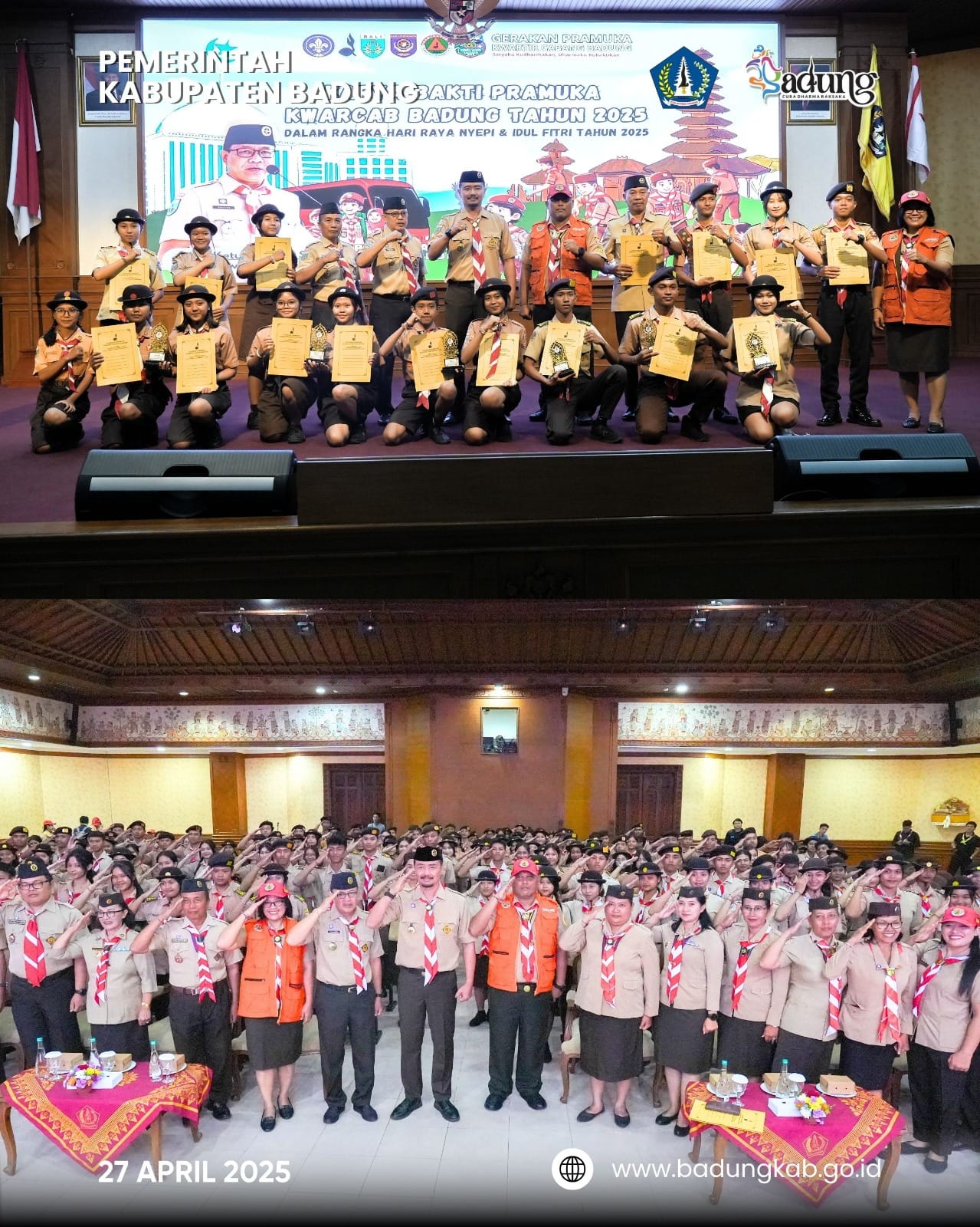 BADUNG – VISIBALI.COM. Gerakan Pramuka Kwartir Cabang (Kwarcab) Badung resmi menutup kegiatan Karya Bakti Pramuka yang digelar dalam rangka Hari Raya Nyepi dan Idul Fitri 2025. Penutupan kegiatan berlangsung pada Minggu (27/4/2025) di Ruang Kertha Gosana, Puspem Badung.