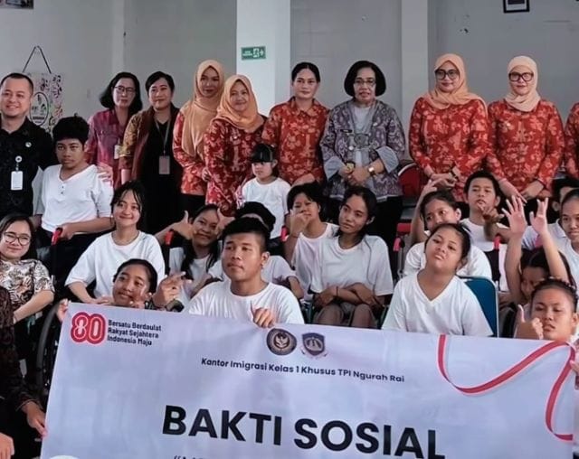 BADUNG – VISIBALI.COM. Dalam rangka memperingati HUT ke-80 Kemerdekaan Republik Indonesia, Kantor Imigrasi Kelas I Khusus TPI Ngurah Rai bersama Dharma Wanita Persatuan menggelar kegiatan bakti sosial di Yayasan Pembinaan Anak Cacat (YPAC) Jimbaran, Selasa (12/8).