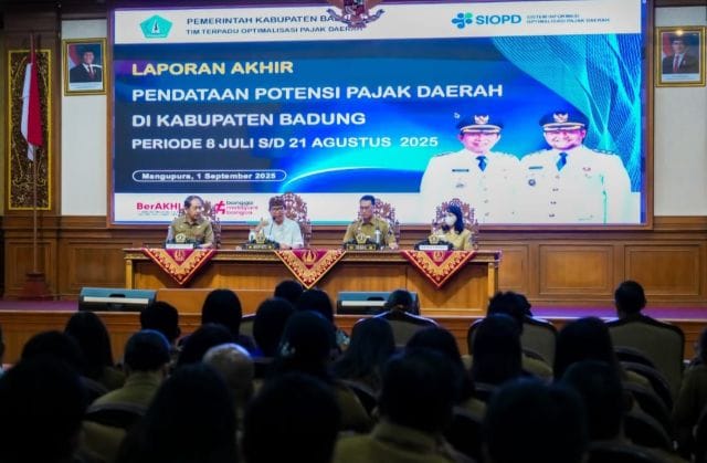 BADUNG – VISIBALI.COM. Pemkab. Badung melaksanakan rapat finalisasi laporan akhir pendataan potensi pajak daerah di ruang Kertha Gosana, Puspem Badung, Senin (1/9). Rapat dipimpin langsung Bupati Badung I Wayan Adi Arnawa didampingi Sekda Badung IB Surya Suamba selaku Ketua Tim Terpadu Optimalisasi Pajak Daerah (TOPD) dan diikuti Kadis Penanaman Modal dan Pelayanan Terpadu Satu Pintu (PMPTSP) I Made Agus Aryawan selaku Sekretaris I Tim TOPD, Kepala Bapenda Ni Putu Sukarini selaku Sekretaris II Tim TOPD, dari Kejari Badung sebagai anggota Tim serta Petugas Pendataan dari Perangkat Daerah dan Tim Teknis Sistem Informasi Optimalisasi Pajak Daerah (SIOPD).