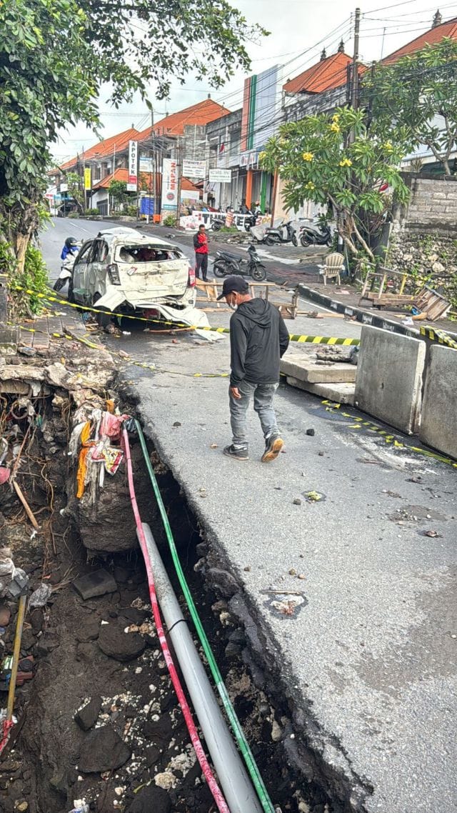 Karyasa menambahkan, di bawah ruas jalan tersebut terdapat gorong-gorong saluran irigasi berukuran lebar 2,4 meter dan tinggi 1,8 meter. Kerusakan jalan disebabkan hujan deras yang memicu luapan air hingga menggerus konstruksi.